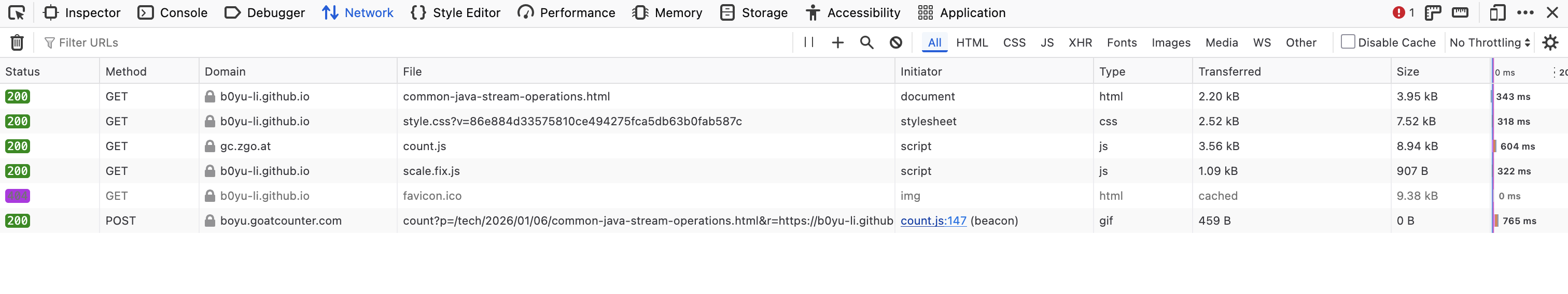 Since I am a developer, my first instinct was to open the browser console to verify that the browser was actually talking to GoatCounter. As you can see, when I load one of my posts, it works!
